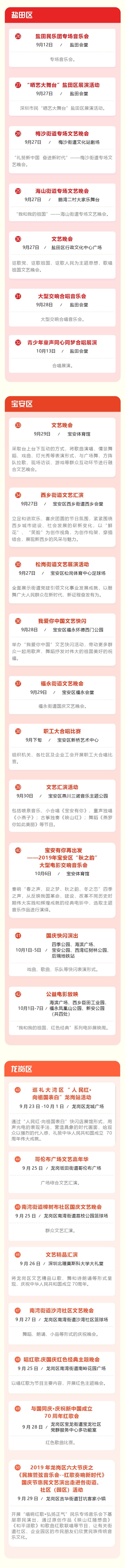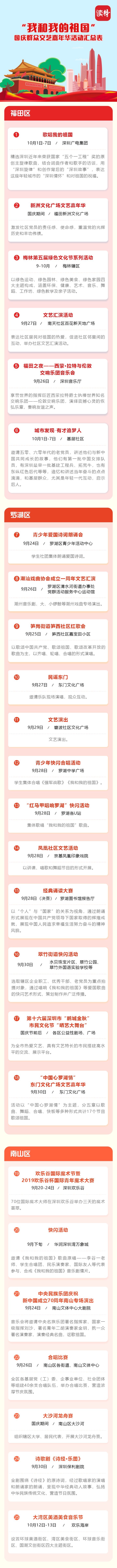 深圳特区报2019年9月26日讯 为热烈庆祝中华人民共和国成立70周年,深圳市将举办规模盛大的全市性专场音乐会、群众文艺晚会、焰火晚会等活动,同时将在各区举办80场“我和我的祖国”国庆群众文艺嘉年华活动,并在全市各区举行“爱我中华——南粤百园庆国庆”主题游园。各有关活动安排如下: