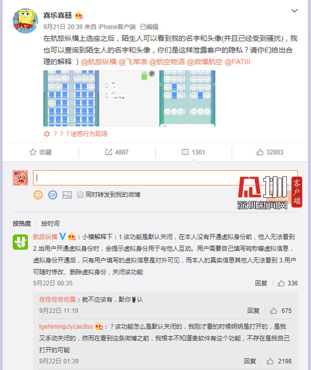 见圳客户端.深圳新闻网2019年9月26日讯(见圳客户端、深圳新闻网记者 张玲)“航旅纵横”APP,最近因为一个举动被用户质疑泄露个人隐私。9月21日,微博网友@喜乐喜囍发微博称,这款APP默认开启“允许他人与我进行私聊”,在用户选座后,陌生人可以查询到自己的名字和头像。该博主将陌生人骚扰的页面截图发上了微博,引发网友热烈讨论,在其个人话题下,有评论1301条,转发4807次。