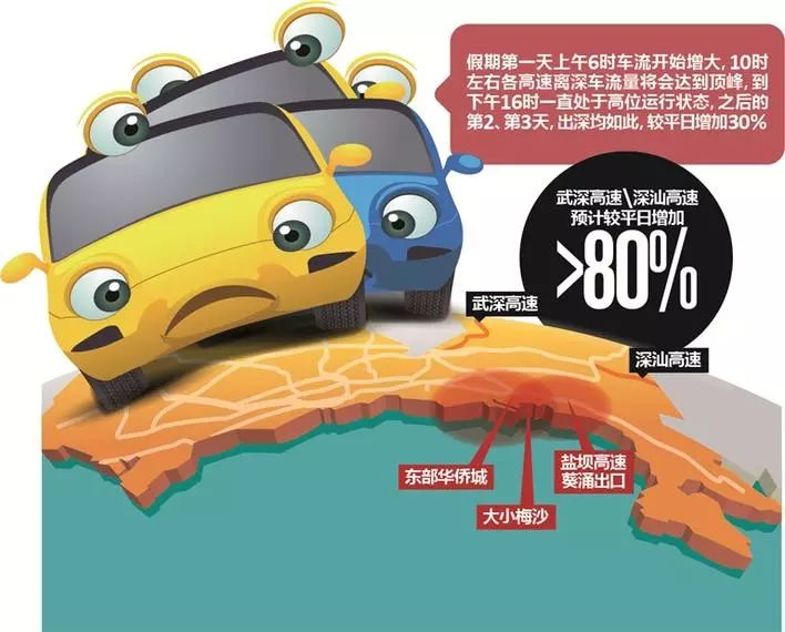 ⑩深圳交警预测全市从9月30日下午开始交通流量加大,9月30日、10月1日出行量达到顶峰。各高速公路、市内各景点、商圈、购物点以及东部景区会出现不同程度的拥堵,全市各区罗湖区最为拥堵,其次是福田区、南山区。预计‘国庆’期间,全市出深和入深车辆总数均将超过170万辆。