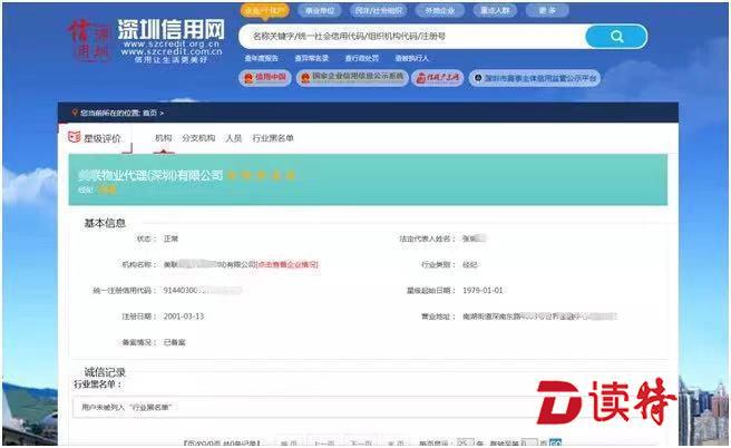 用户登录“深圳信用网”,只需根据页面指示搜索相关键字,查询页面即可查到房地产中介机构的注册备案地址、注册时间、星级评价以及诚信记录等信息。