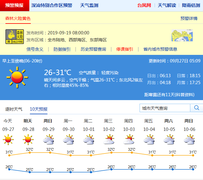 见圳客户端·深圳新闻网2019年9月27日讯 深圳未来一周晴天间多云,阳光充足,天气干燥,其中29-30日云量增加,湿度略有加大;10月初晴天间多云。