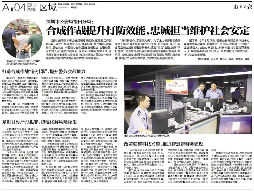 “合成作战中心成立的最根本初衷,是汇集分局最优质的手段资源,服务、倾斜基层一线,以5%的警力有力支撑分局案件打击和维稳处突,不看广告看疗效,警务创新的红利是否惠及基层,他们的感受才是最真实。”福田公安分局网络警察大队大队长余文亮说。