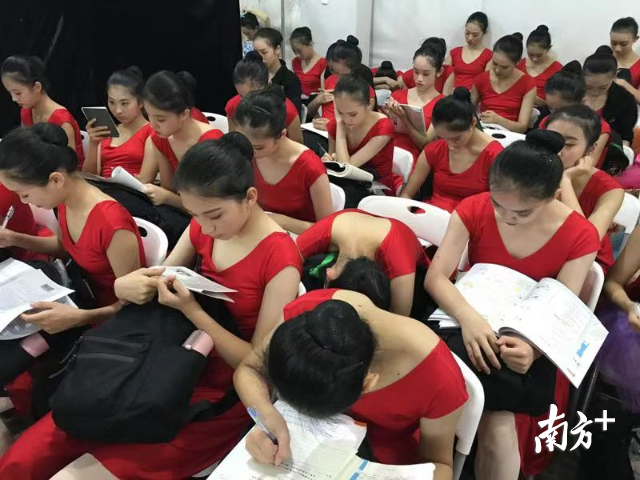 在晚会的另一个彩排候场点,36名来自深圳高级中学舞蹈团的参演学生在彩排和演出间隙仍然抓紧学习。深圳高级中学舞蹈团老师高洁说,这是舞团候场的常态,“为了不耽误学习,经常得抓紧间隙进行学习。”