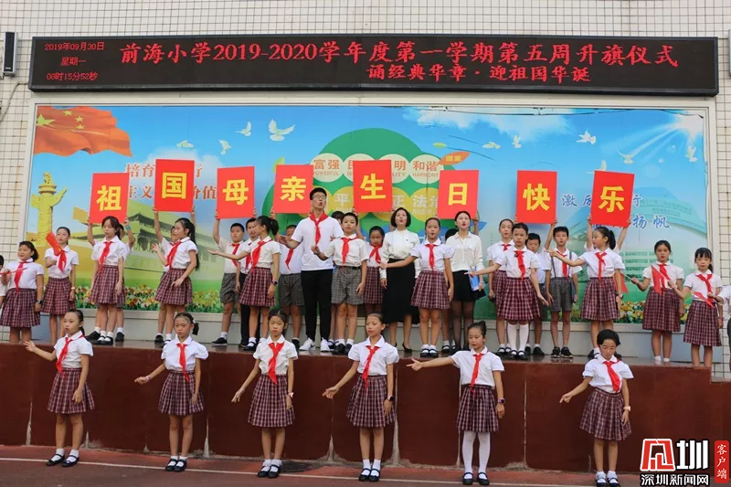 见圳客户端、深圳新闻网2019年9月30日讯(见圳客户端、深圳新闻网记者 陈彬 通讯员 罗其洁 潘志高)为庆祝中华人民共和国成立70周年,加强爱国主义教育,践行社会主义核心价值观,前海小学通过举行爱国教育三部曲,祝愿伟大的祖国繁荣昌盛。