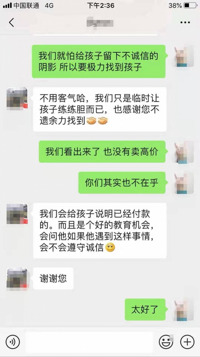 卖水男孩爸爸告诉张先生,他是从朋友的转发中,看到这个消息的。他介绍说,他们那天只是临时让孩子练练胆,并对张先生努力寻找孩子,实现对孩子承诺的诚信行为表示感谢。“我会给孩子说明已经付款的,而且这是个好的教育机会,我会问他,如果他遇到这样的事情,会不会遵守诚信。”卖水男孩爸爸告诉张先生,“没有想到你为了守护一份诚信,借助网络媒体的力量,花大力气寻找并支付矿泉水钱,这份坚持,让我们和孩子都非常感动。我们也已经与孩子沟通整件事情,并借此机会告诉他换位思考,如果遇到类似情况,也应坚持诚信、与人为善的传统美德。”