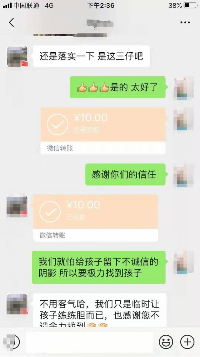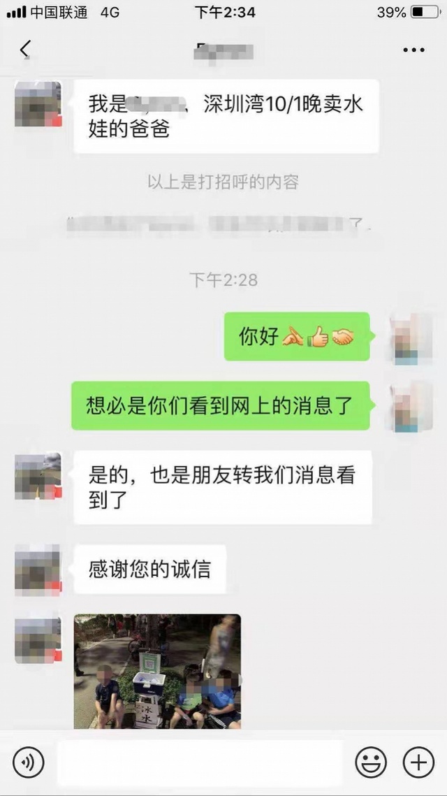 4日,刚从深圳返回青岛的张先生告诉记者,中午2时35分,他的微信出现一个新增好友,对方说自己是深圳湾10月1日晚卖水男孩的爸爸,张先生立刻把对方加为好友。卖水男孩爸爸通过微信给张先生发来一张照片,是国庆当晚孩子在路边卖水时拍的,让张先生确认一下是不是照片上的孩子。“是他们,太好了,终于找到了。”张先生随即通过微信转账10元钱过去,卖水男孩爸爸也收款成功。(此前报道:紧急寻人!深圳湾畔的卖水孩子,青岛大叔在找你…)