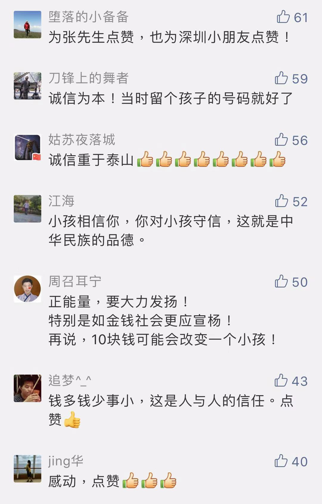 深圳特区报2019年10月4日讯 近日,一则寻人信息在微信朋友圈被广泛转发——来自青岛的张先生在深圳看完国庆烟花表演后,回家路上遇到一个摆摊卖水的男孩,口渴难耐的张先生买了5瓶矿泉水,却因为网络不好无法完成手机支付,拍摄的保存的二维码又因太模糊无法识别,最终张先生只能通过朋友圈“寻人”转账。4日,记者通过张先生得知,他已经联系上卖水男孩的父亲,并且成功支付了10元的水钱。