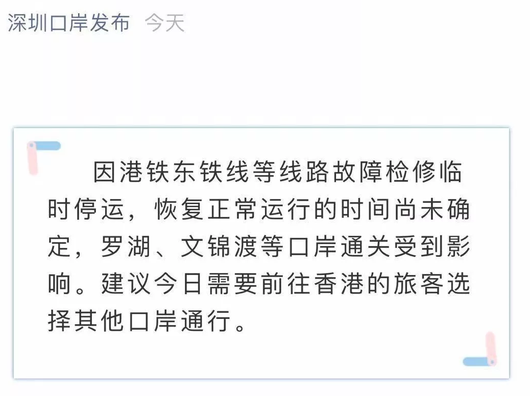昨天上午11点,深圳市口岸办官方微信号“深圳口岸发布”发布消息:因港铁东铁线等线路故障检修临时停运,恢复正常运行的时间尚未确定,罗湖、文锦渡等口岸通关受到影响。建议今日需要前往香港的旅客选择其他口岸通行。