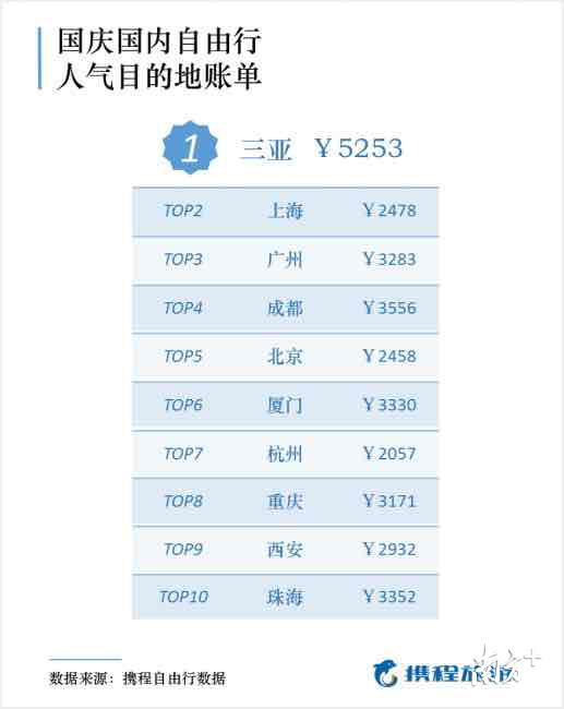 而哪些目的地在国庆期间最能吸引自由行游客?根据携程自由行数据,三亚、上海、广州、成都、北京、厦门、杭州、重庆、西安和珠海。其中国庆前往三亚度假已经成为潮流,单次人均花费为5253元。
