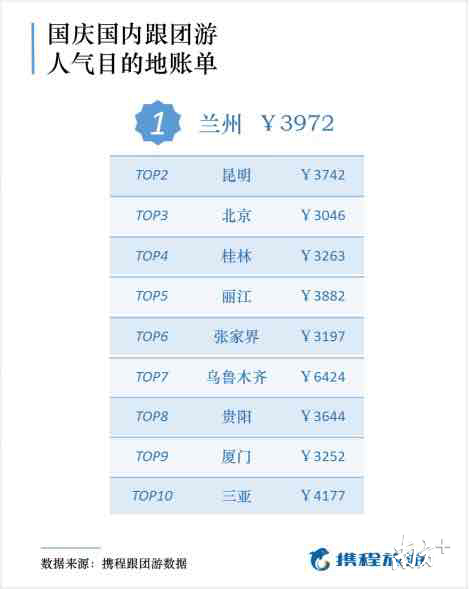 哪些国内旅游城市是今年国庆的赢家?根据携程跟团游,最受游客欢迎的国内旅游城市前十分别是兰州、昆明、北京、桂林、丽江、张家界、乌鲁木齐、贵阳、厦门和三亚。其中前往兰州人均花费近4000元。