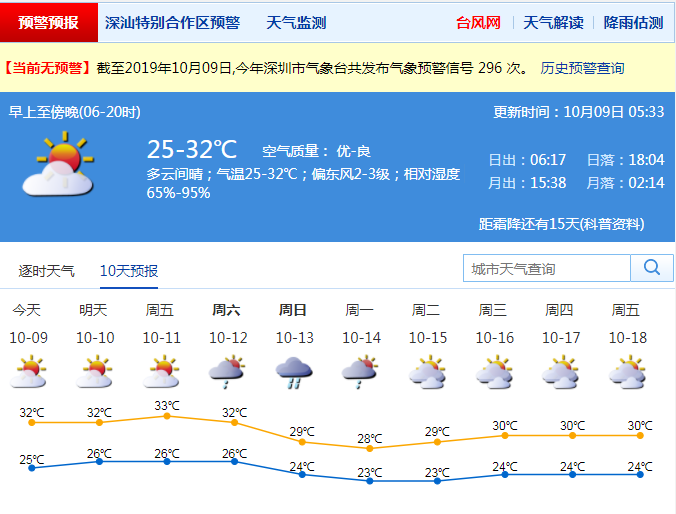 见圳客户端·深圳新闻网2019年10月9日讯 据深圳市气象局消息,9日,深圳多云间晴;气温25-32℃;偏东风2-3级;相对湿度65%-95%。