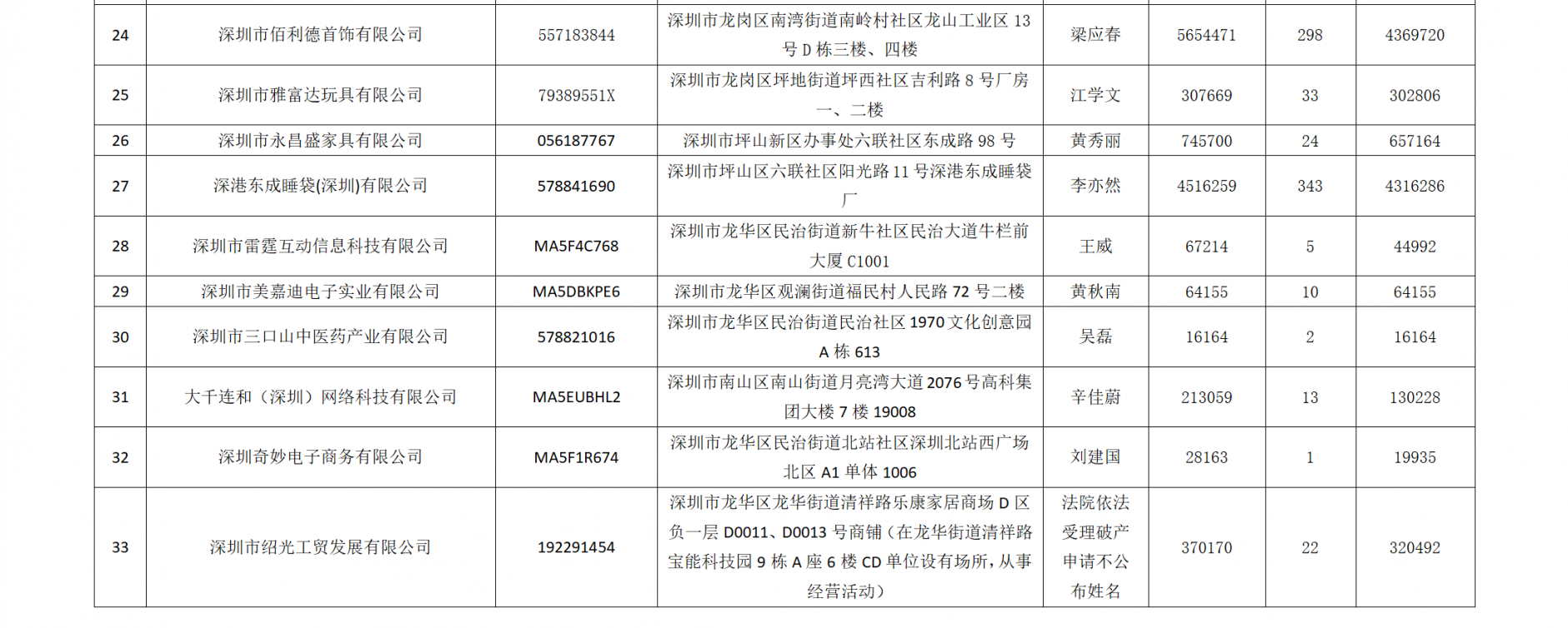 记者发现,在此次被曝光的33家企业中,被垫付欠薪数额最大的是位于龙岗区南湾街道南岭村社区龙山工业区的深圳市佰利德首饰有限公司,拖欠员工工资约565.45万元,市欠薪保障基金垫付298名员工工资436.97万元;其次是位于坪山区六联社区的深港东成睡袋(深圳)有限公司,拖欠员工工资约451.63万元,市欠薪保障基金垫付343名员工工资约431.63万元。