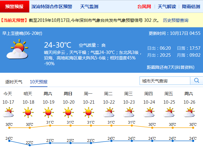 见圳客户端·深圳新闻网2019年10月17日讯 15日夜间到16日白天,我市晴天间多云,有分散阵雨,最大雨量出现在龙城街道爱联站5.4毫米;早晨最低气温22-24℃;东风2-3级,沿海和高地阵风6-7级;相对湿度40%-90%。