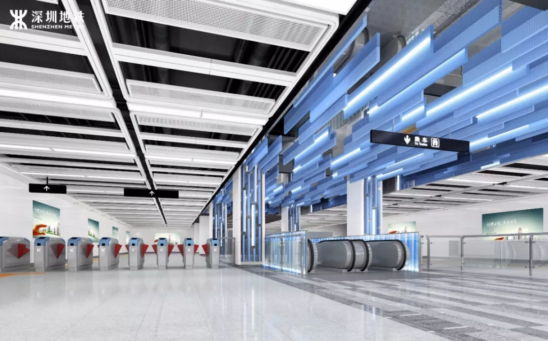综合考虑前海地下漫行系统,在楼梯口部重点利用智慧科技及灯光设计,表现前海特色,使之成为视觉焦点,突出垂直交通枢纽,达到高效交通目的。