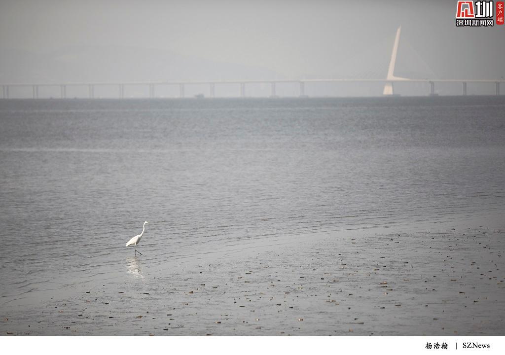2019年10月17日,深圳湾公园,鸟类的白色羽毛和远处白色的深圳湾公路大桥,成了一景。