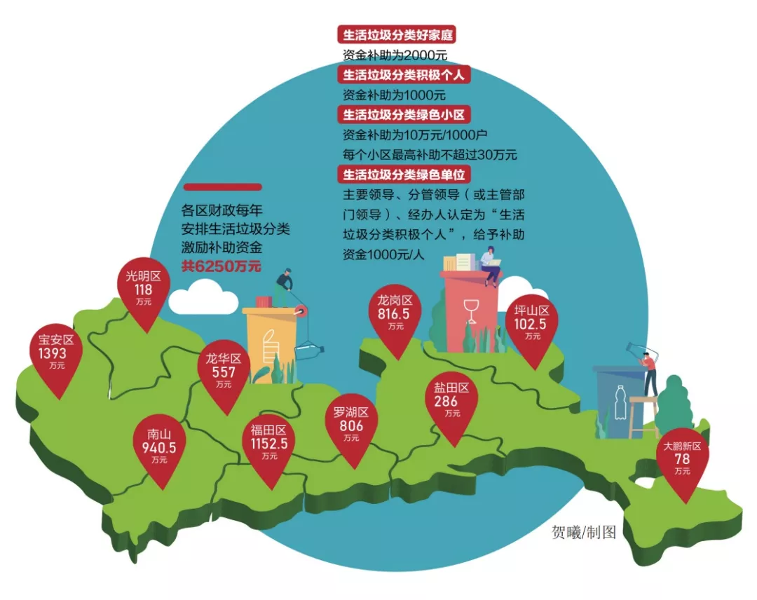 《办法》明确规定,各区财政每年按以下额度安排生活垃圾分类激励补助资金: