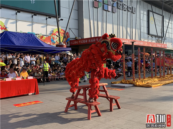 展演中,舞狮时而上下连蹿,时而饮酒自嗨,拟人化的动作特点引来观众共鸣,而开阔的舞台更是中心点,吸引了不少来往市民驻足观赏,观众中掌声阵阵。