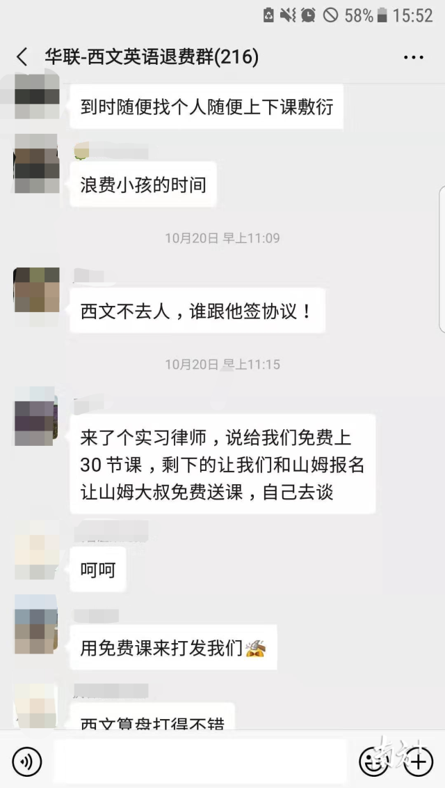 退费群里的周女士介绍,10月20日,西文英语提供了一份“英语培训课程三方协议书”,但上面很多条款都没有写清楚。西文英语委托的律师称,山姆大叔少儿英语愿意给西文英语的学员免费提供30节课程,但学员在西文英语其他剩余课时的解决方案,需自行和山姆大叔协商。
