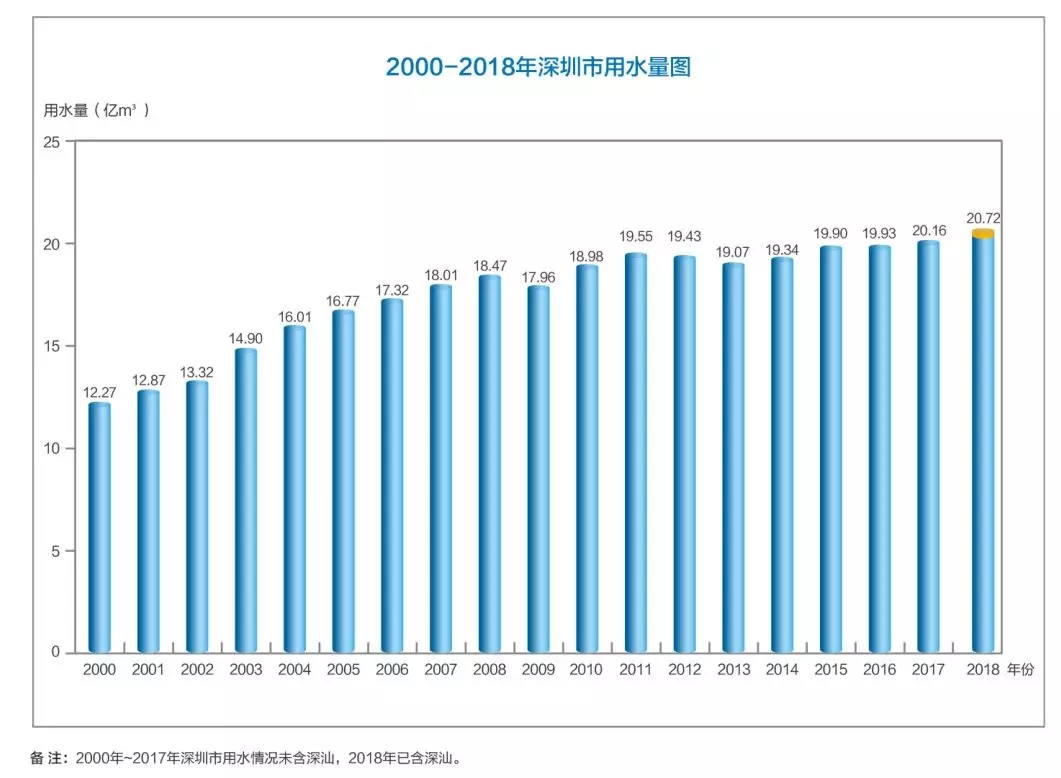 2000-2018年,深圳市用水量整体呈现递增趋势。2018年,深圳市(未含深汕合作区)万元GDP用水量8.41立方米,位列全国大城市前列。