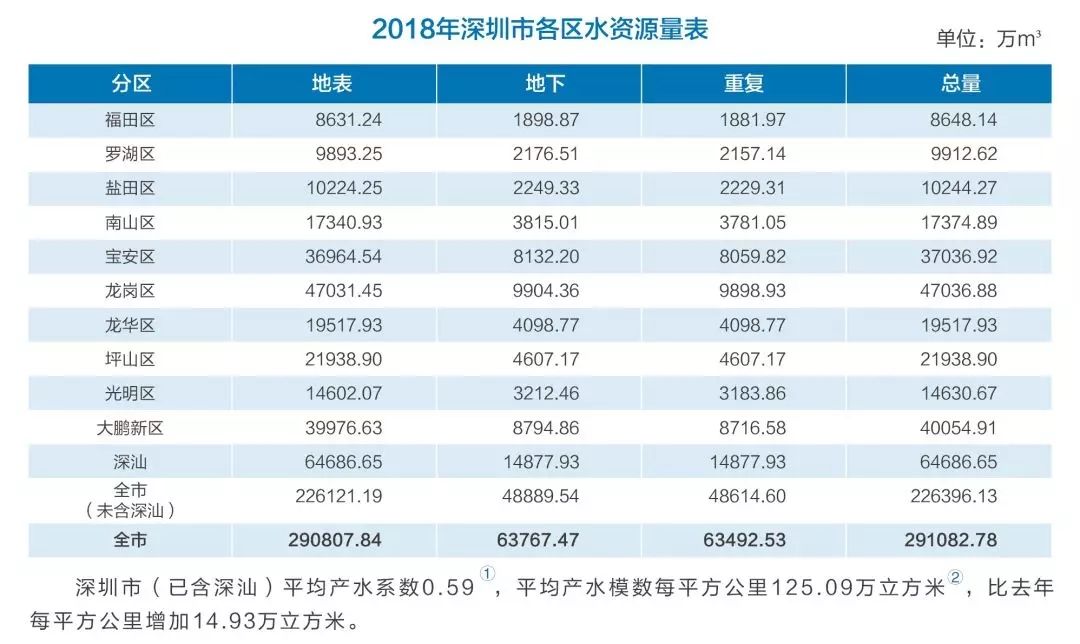 2018年深圳市(含深汕合作区)水资源总量29.11亿立方米,同比增加34730.70万立方米(13.58%),较常年增加21295.94万立方米(7.89%)。2018年深圳市(未含深汕合作区)总供水量203264.57万立方米,同比增加1614.85万立方米。