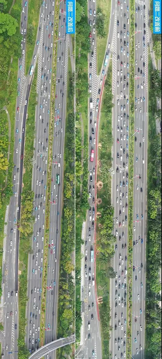 同时,造成沙河西右转滨海大道处拥堵的,还有一个原因是主道车流与原辅道车流汇合后,局部交织冲突严重。为此,交警压缩了辅道绿化隔离带,将2车道扩宽为3车道!原辅道车流无需变道,即可顺利通行。