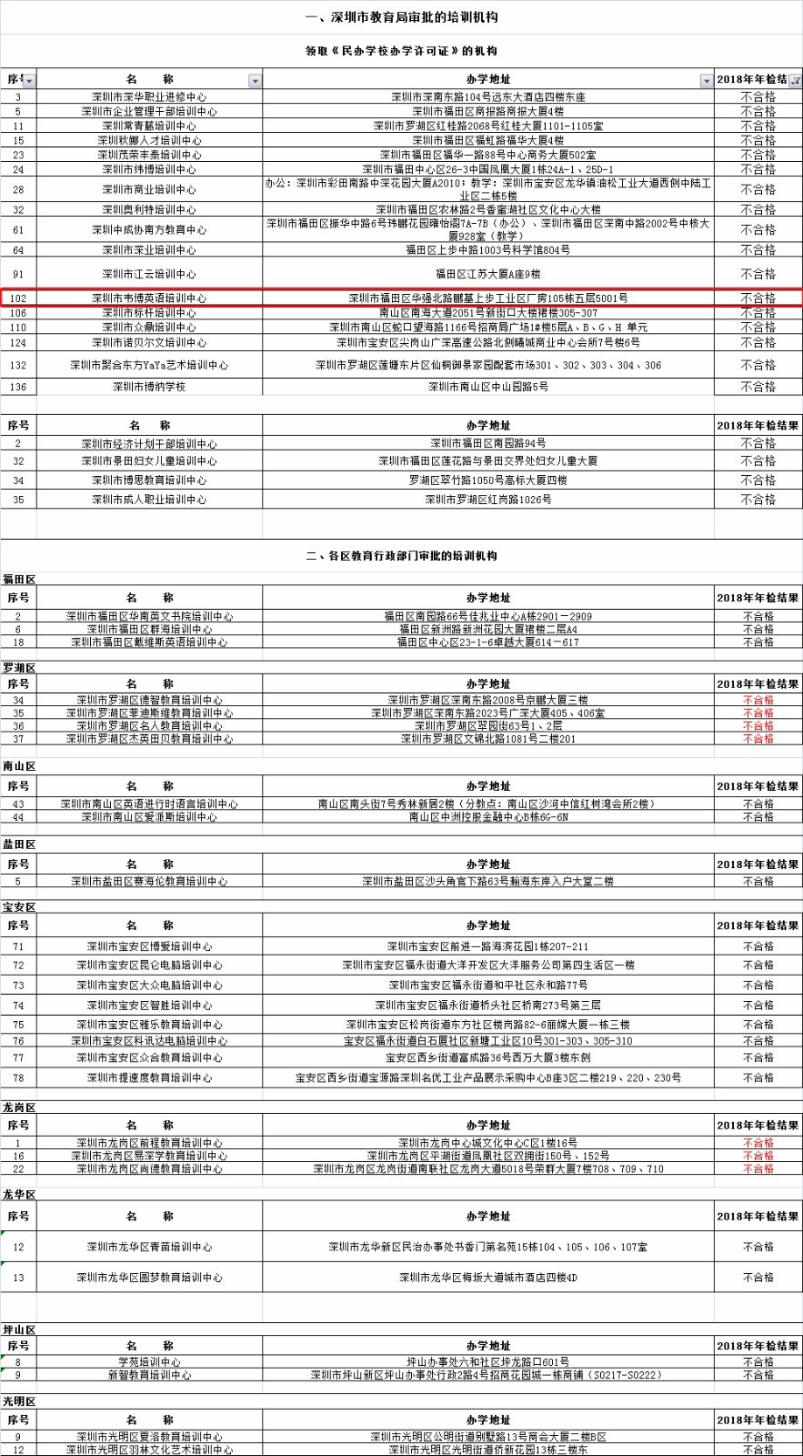 据悉,此次公告包括取得《中华人民共和国民办学校办学许可证》和《深圳市成人教育办学机构注册证》的教育培训机构的办学基本信息、2018年度年检结果、新设立培训机构及培训机构分教点地址等基本信息。