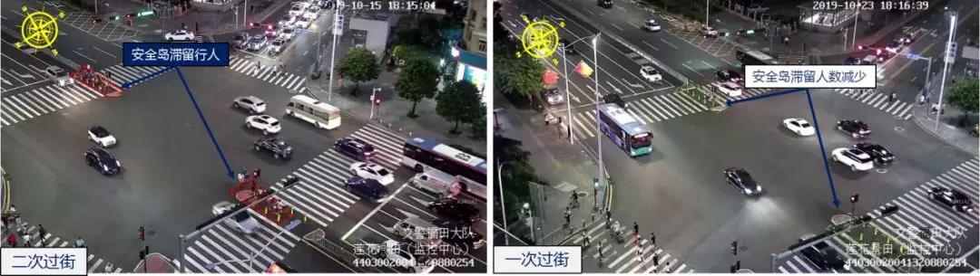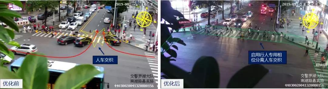 对此,深圳交警于9月11日对该路口进行再优化,调整东西向机动车放行方案,分离北面行人与西面左转车,从而保障北面行人过街安全。优化后,该路口东西行行人与同向左转车分离,行人过街安全更有保障。