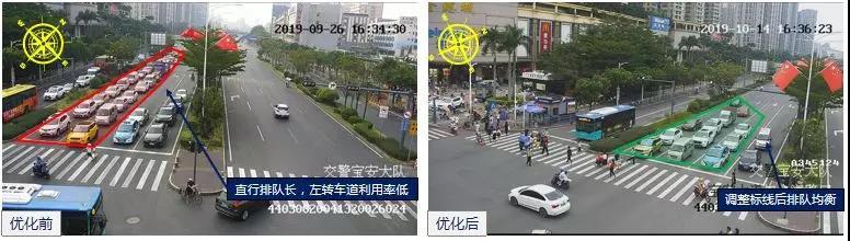 针对这一问题,深圳交警根据路口各时段、各方向的通勤需求,调整优化了路口红绿灯配时方案,适当增加了拥堵方向时间。优化后,路口晚高峰西往东方向车辆排队由300多米降至60米左右,下降80%,车辆基本实现1次通行。