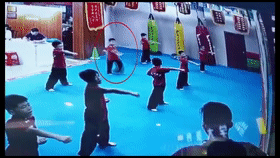 ▲监控画面显示,男教练员拿起长棍,直接扔向小刘,棍子击中孩子头部