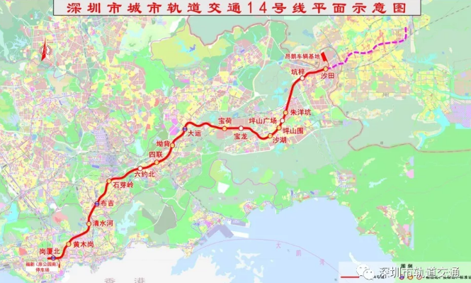 站点:岗厦北、黄木岗、清水河、布吉、石芽岭、六约北、四联、坳背、大运、宝荷、宝龙、沙湖、坪山围、坪山广场、朱洋坑、坑梓、沙田