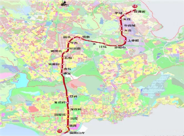 站点:福田口岸、福民、岗厦、岗厦北、莲花村、冬瓜岭、孖岭、雅宝、南坑、光雅园、五和、坂田北、贝尔路、华为、岗头、雪象、甘坑、凉帽山、上李朗、木古、华南城、禾花、平湖、双拥街