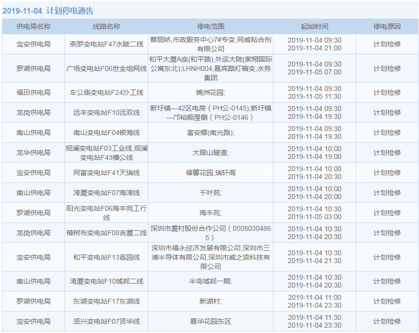 11月1日-15日,深圳这些地方将停电(附全名单)
