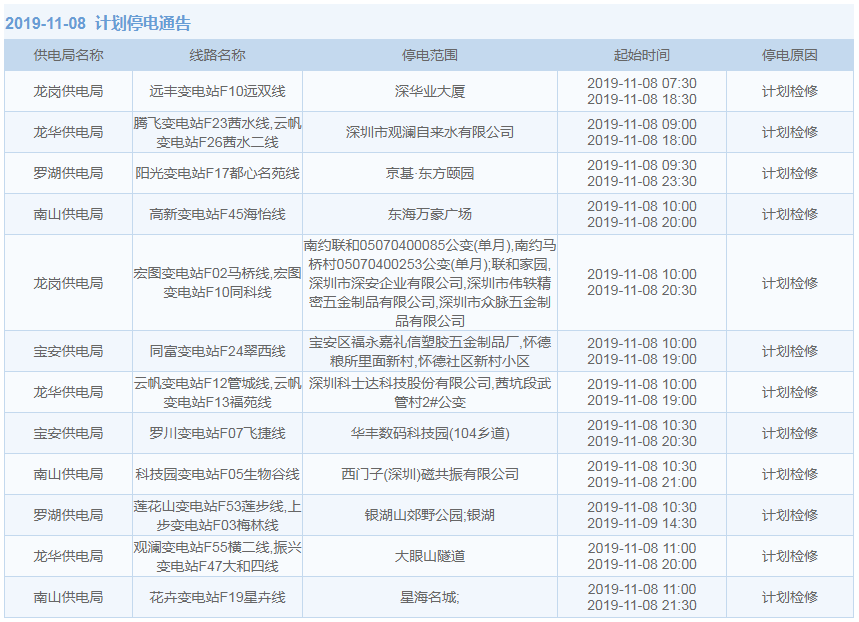 11月1日-15日,深圳这些地方将停电(附全名单)