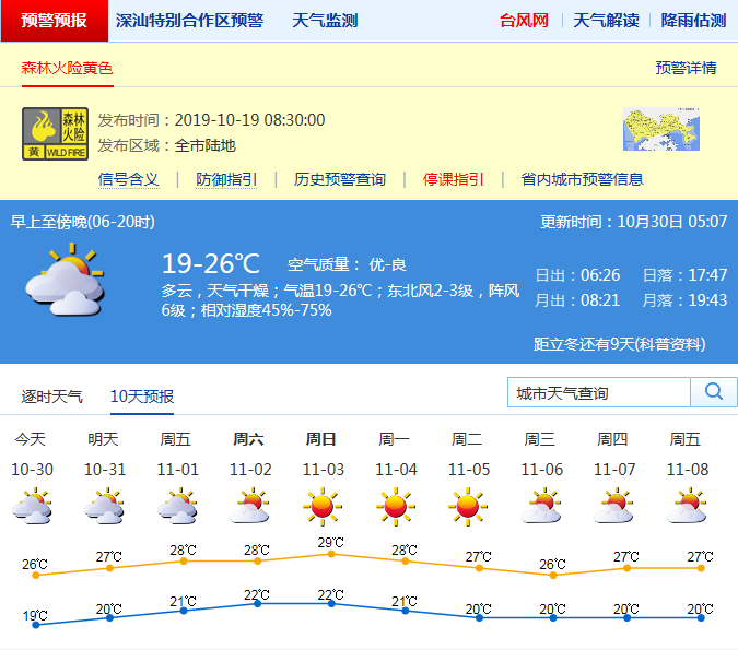 见圳客户端·深圳新闻网2019年10月30日讯 深圳市气象局预计30-31日多云间晴天,空气干燥,气温19-26℃,早晚较凉;受冷空气和热带低压共同影响,30-31日沿海、高地和海区阵风6-7级。11月1-5日晴天间多云,昼夜温差加大,空气持续干燥。