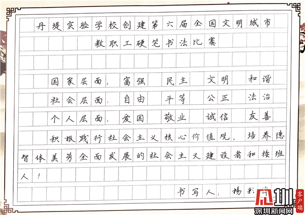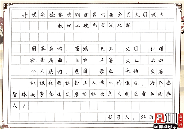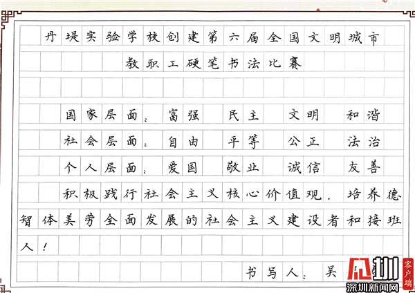 见圳客户端·深圳新闻网10月29日讯(见圳客户端、深圳新闻网记者 潘宝仪 通讯员 袁小俊 图/朱雅琪 ) 为落实立德树人总目标、培育和践行社会主义核心价值观,创建文明城市,积极倡导全校教职工勤练教学基本功,提高教师综合素养,丰富课余生活,展示丹堤实验学校教职工风采,学校于10月25日举行了“创建第六届全国文明城市教职工硬笔书法比赛”。