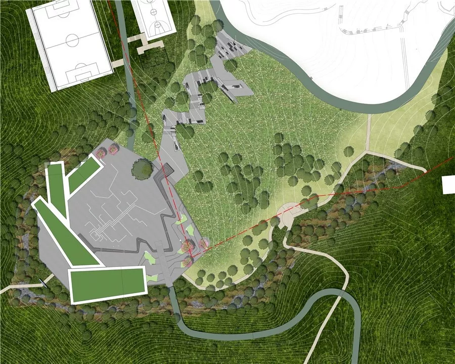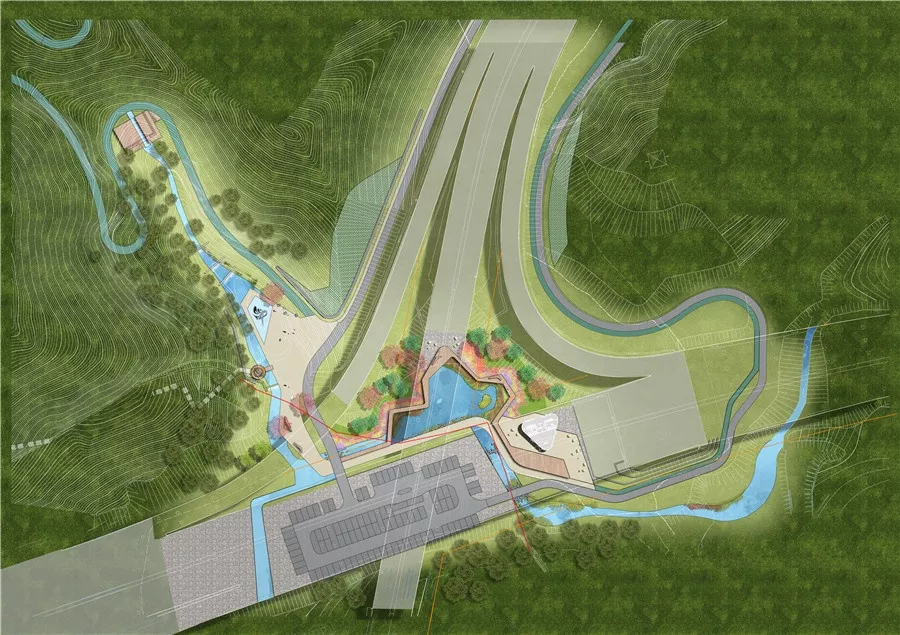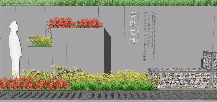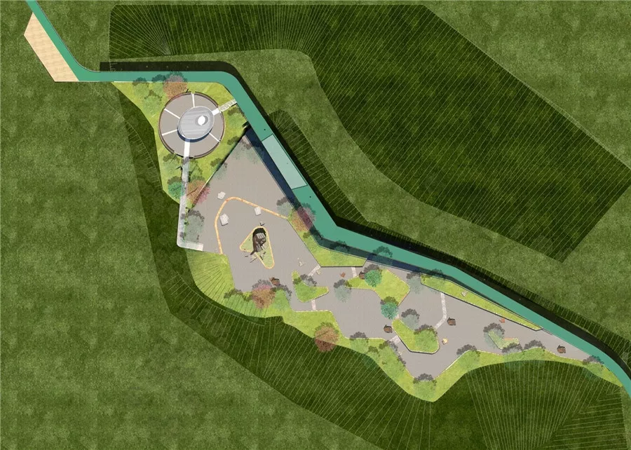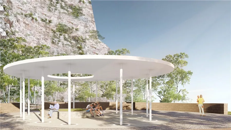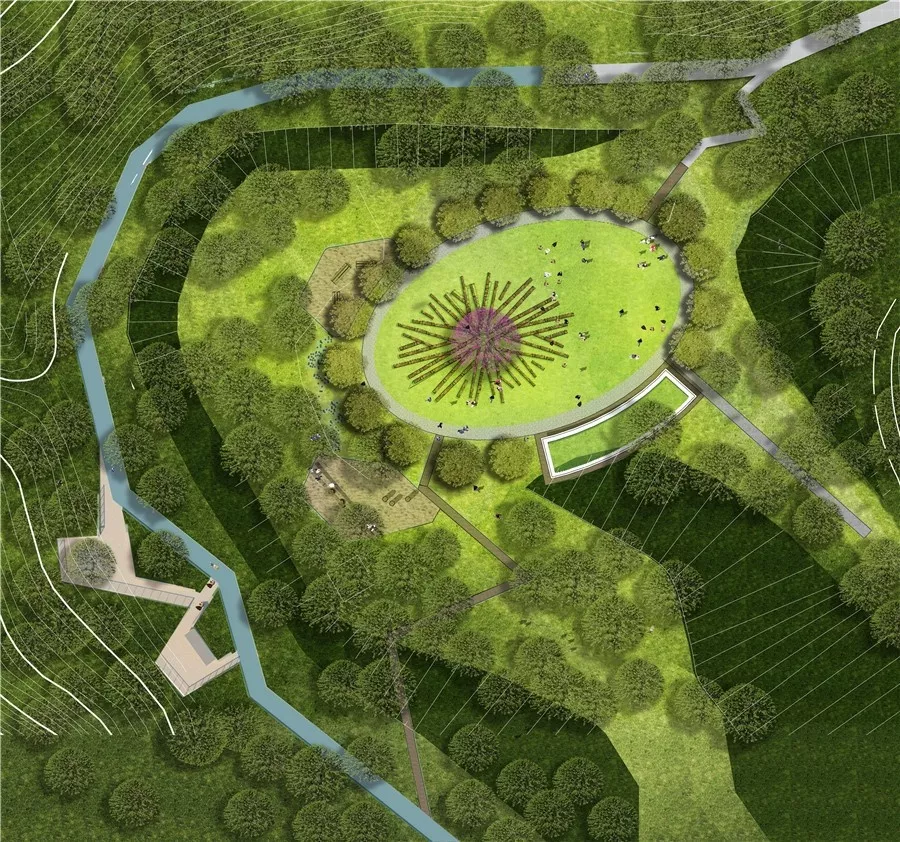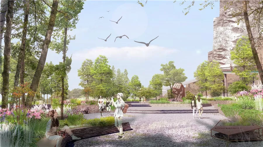 拼搏岩岭的设计试图恢复场地记忆,以石材结合锈板的形式塑造场地表达坚韧精神,同时保留现状的岩生植物表达顽强拼搏的生命力。