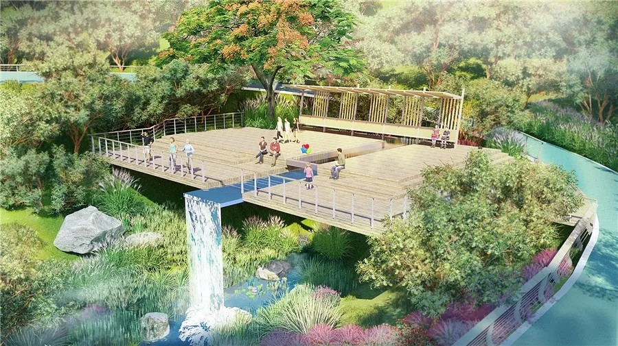 天然的溪谷,沿线配上蝴蝶花、天堂鸟、鸢尾等寓意幸福的开花植物,营造出一片繁花似锦、彩蝶纷飞的温馨景观,代表着人才在深圳奋斗的成果,也寓意着人才内心满满的幸福感。