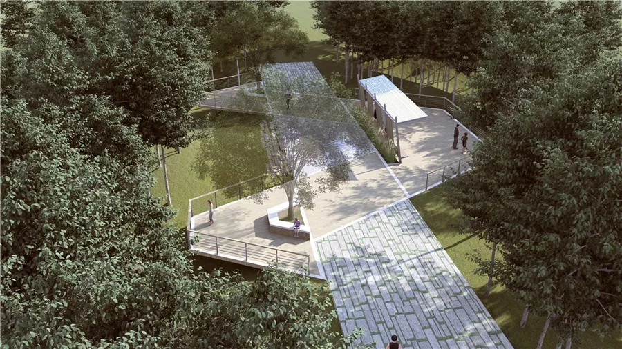 利用现状平台进行改造提升,场地形式由“人”字演化而来,廊架也取自“人”形元素进行设计,平台北向俯瞰群贤广场,南面则朝向求知花园,具有一揽众英才之意。