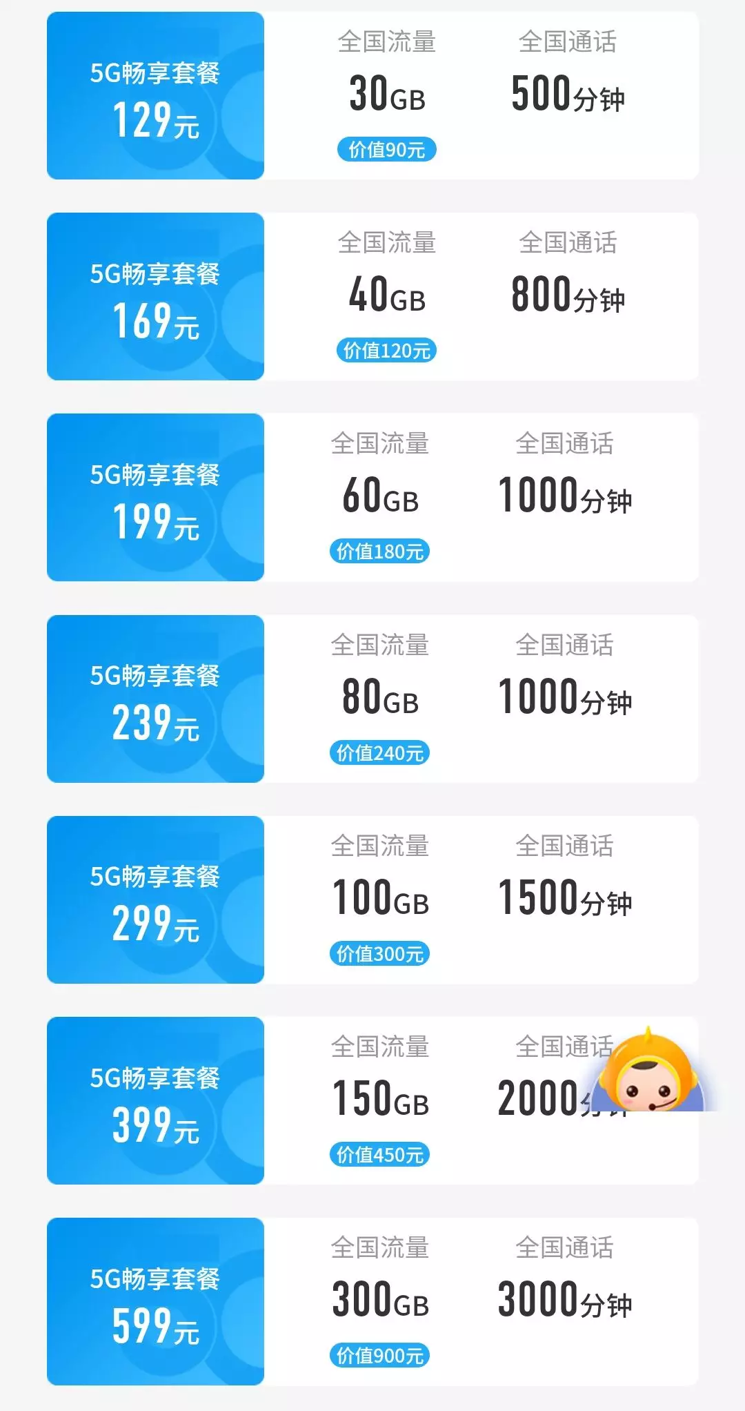 而中国联通的套餐则与电信类似,同样有7个档次。最低档为129元每月(30GB)500分钟通话,最高档次为599元每月(300GB)3000分钟通话。