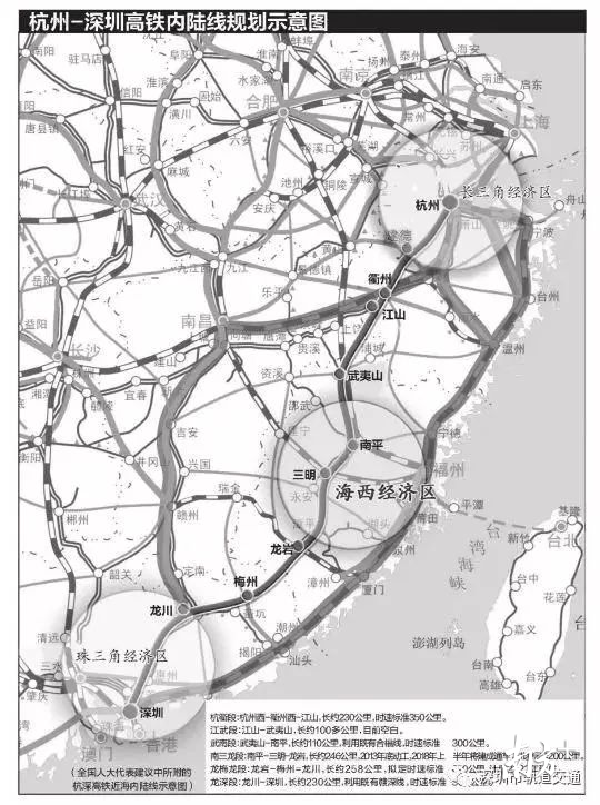 去年,参加全国两会的部分全国人大代表提出一份《关于将杭深高铁近海内陆线列入国家“十三五”现代综合交通发展规划修编和国家中长期铁路网规划的建议》。杭深高铁近海内陆线拟自杭州西经衢州西-江山-武夷山-南平-三明-龙岩-梅州-龙川至深圳,总长约1200公里。