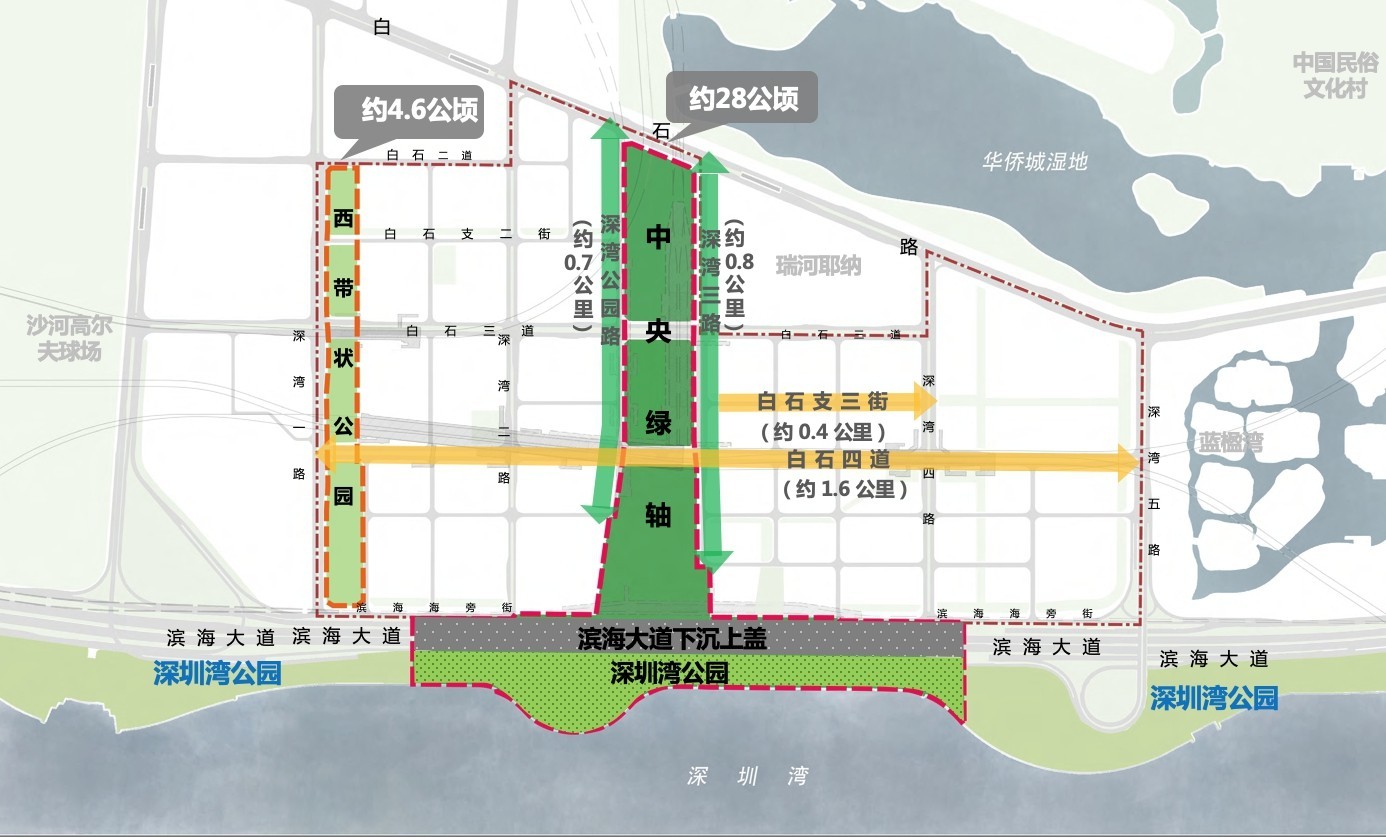 国际咨询的重点设计范围为中央绿轴(约28公顷,含滨海大道下沉上盖和深圳湾公园部分区域)(含深湾公园路、深湾三路街道空间)、片区重要街道(白石四道、白石支三街)、西带状公园(约4.6公顷)等。