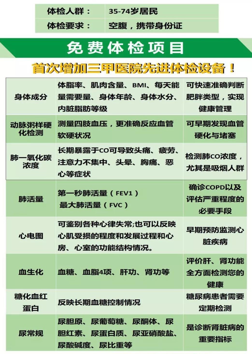 本次免费体检面向35-74岁深圳居民,主要为居民提供的体检项目包括:免费建立健康档案,中医体质辨识服务;免费检测尿常规、血常规;免费检测血生化(血糖、肝功、肾功);免费做心电图检查;免费测量肺功能、肺一氧化碳含量;免费测量身体成份,判别自身的健康状态。需要提醒的是,体检要求空腹,且要携带身份证。