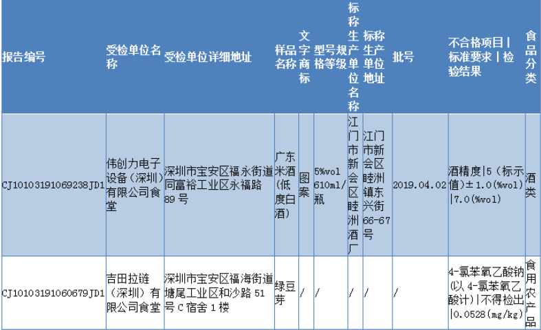 见圳客户端 ·深圳新闻网2019年11月6日讯 11月5日,深圳市市场监督管理局发布2019年第四十期食品安全抽样检验情况通报,通报称,深圳市市场监督管理局于2019年8-9月组织对我市餐饮环节的食品开展了抽样检验工作,本次共抽检餐饮环节食品671批次,涉及餐饮环节经营主体584家次,共检测食品指标3385项次。其中检出不合格样品12批次,涉及不合格食品类别有酒类2批次均为米酒;肉制品2批次为腊肉和腊鸭腿;食糖1批次、食用农产品5批次牛蛙、猪肝等在列;蔬菜制品1批次、水产制品1批次。