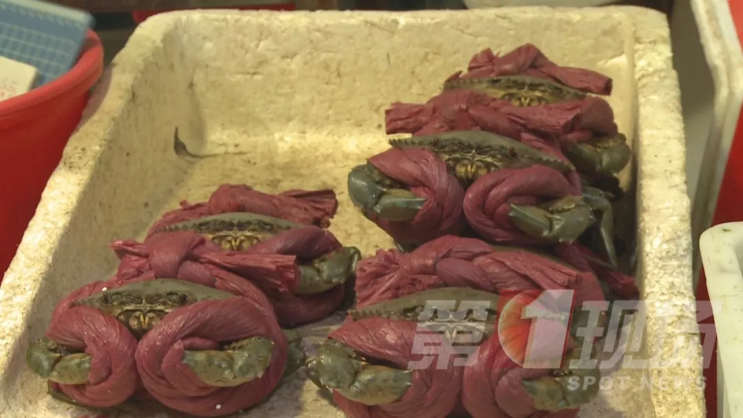 ▲粗大的红色绑蟹绳,吸水后重半斤,这样的膏蟹商家卖85元/斤。