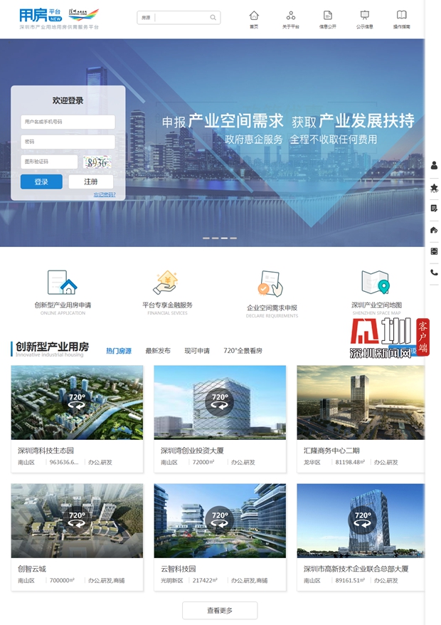 记者在平台官网看到,平台不仅提供创新型产业用房申请入口、平台专享金融服务、企业空间需求申报,还设有深圳产业空间地图、720度全景看房,页面简洁直观。