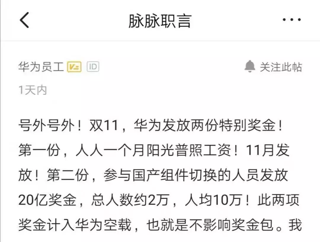 11月11日,据华为员工在职场社交平台爆料称,华为给员工发放了两份特别奖金: