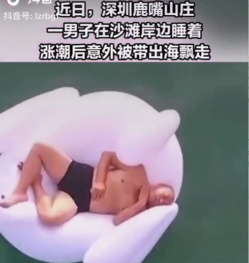 最近,有个视频很火。视频中标注:一男子在深圳鹿嘴山庄游玩时,躺在天鹅气垫上睡着了,涨潮后被带出海飘走,在飘出数公里后他被经过的船叫醒并救起。