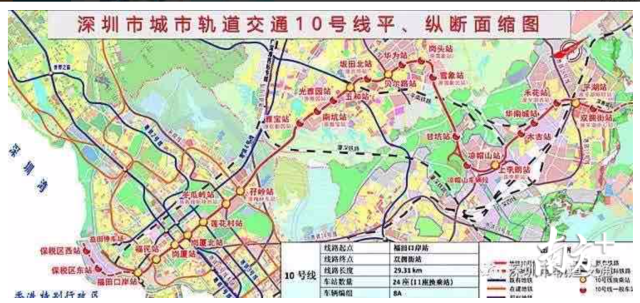 地铁10号线,南连与香港毗邻的福田口岸站,北接龙岗区双拥街,线路全长约29公里,共设车站24座。