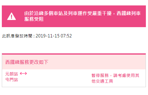 07:52,西铁线服務更改为:元朗站往返屯門站暂停服务。