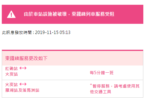 至05:13,港铁更新信息,由于车站设施被破坏,东铁线列车受阻,服务安排更改为:火炭到红磡每5分钟一班,火炭站至罗湖及落马洲站暂停服务。
